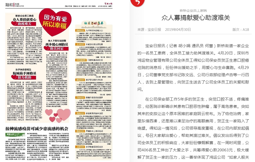 鴻運(yùn)物業(yè)愛心捐助,獲寶安日報(bào)報(bào)道。報(bào)道內(nèi)容如下: