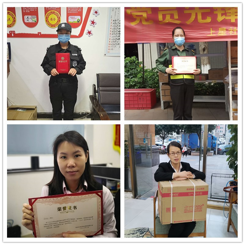 ?????? 根據(jù)征集到的材料,結(jié)合投票和領(lǐng)導(dǎo)評選,婦女節(jié)“最美戰(zhàn)疫逆行者”主題活動的獲獎名單出爐,前5名依次為:沙頭管理處保安史軍華、星悅豪庭管理處保安李冬梅、盛芳園管理處客服郭華容、麒麟花園管理處保安李鳳荷、總辦品質(zhì)部主管鄧亞蘭。公司已為獲獎員工發(fā)放榮譽(yù)證書,并根據(jù)個人需求購買和發(fā)放相應(yīng)的獎品。同時,對每一位參與者,我們都贈送精美小禮品,感謝你們的積極參與!