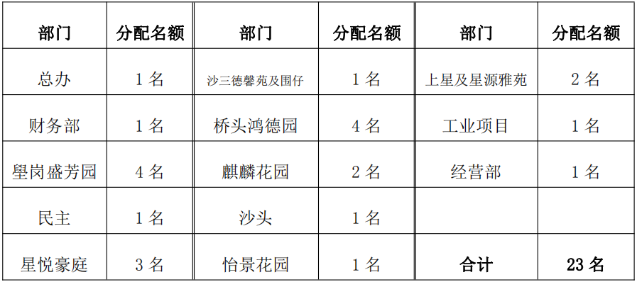 ????? 1、優(yōu)秀員工:23?名,并在優(yōu)秀員工中評(píng)選 3?人獲得“鴻運(yùn)明星員工”稱號(hào),在公司基層員工中選拔推薦,由各管理處內(nèi)部推選提交優(yōu)秀員工推薦表,經(jīng)公司審核通過(guò)公示無(wú)異議后產(chǎn)生;具體分配名額如下: